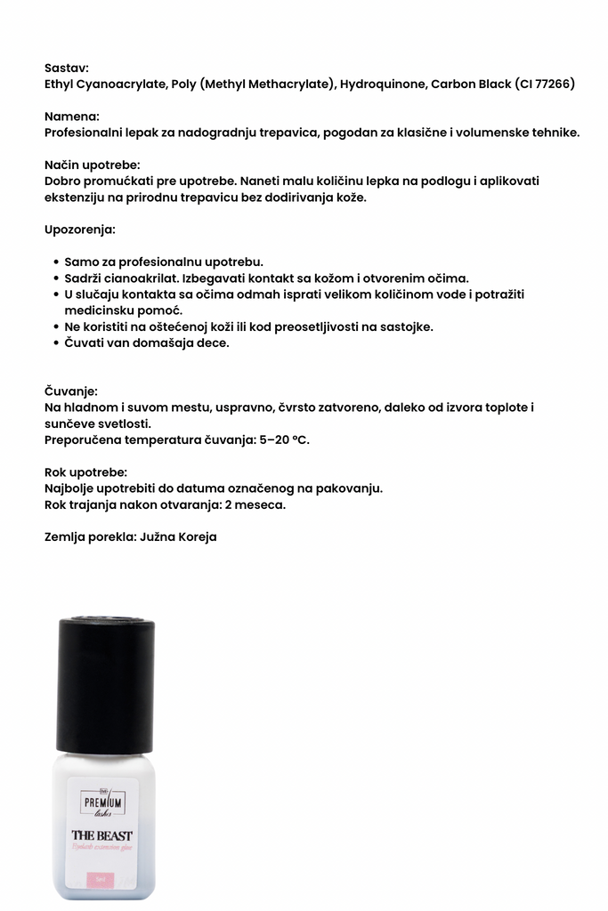 - Brzosušeći lepak (1-2s) koji opravdava svoj naziv. „The Beast“ omogucava jednostavnu primenu zbog svog brzog vezivanja. Takođe sadrži elastičnu komponentu za povećanje izdrživljovsti i dužinu trajanja lepka na nadograđenoj ekstenziji od 6 do 8 nedelja. Idealan za obe tehnike nadogradnje, 1:1 i „ruski volumen“. Prodaje se u crnoj boji.
